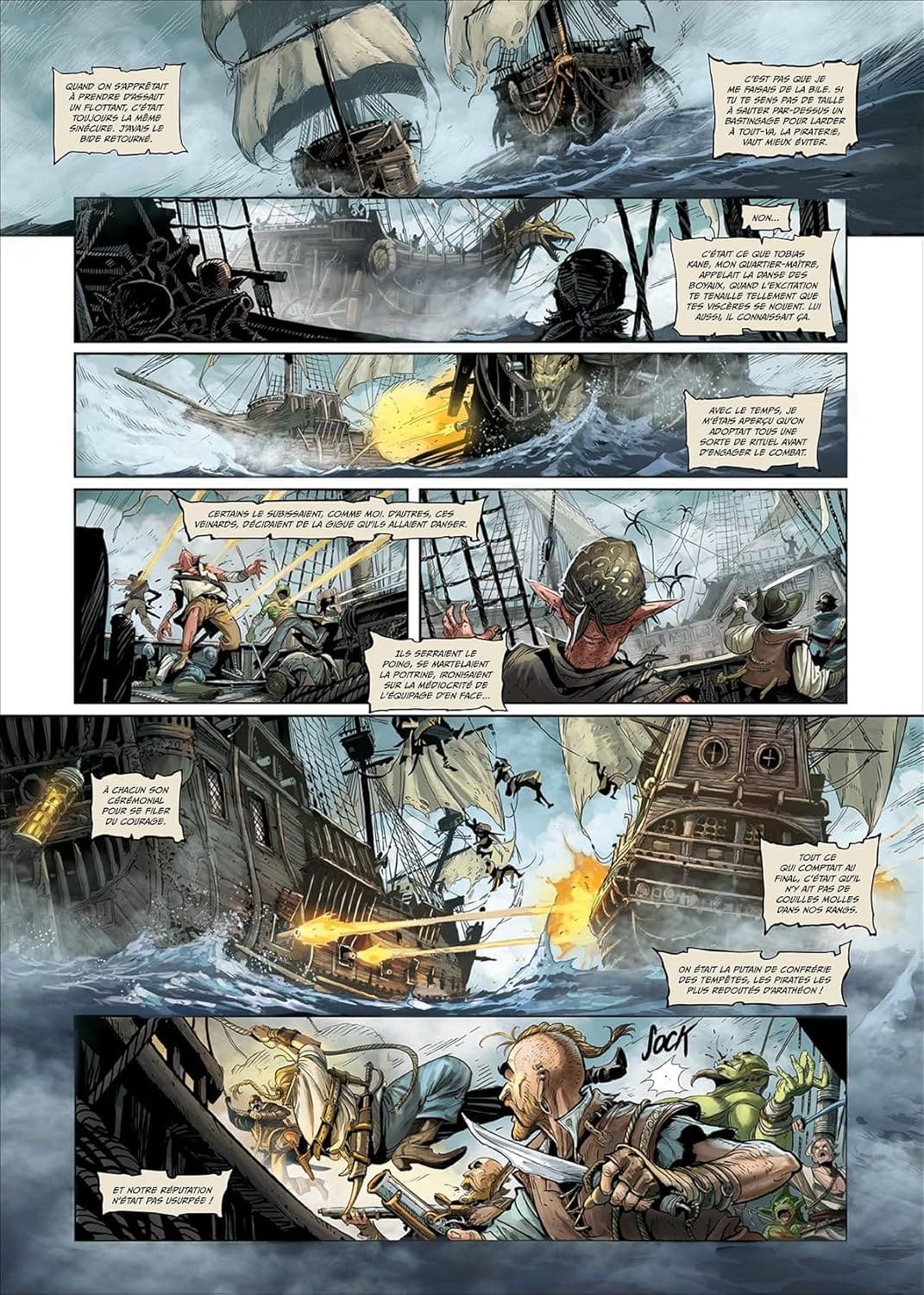Graphiquement, La Confrérie des Tempêtes – Tome 3 conserve une identité forte. Les planches sont riches, structurées de façon à guider l’œil à travers les émotions et les tensions. Les décors, souvent complexes, ajoutent de la profondeur aux scènes et soulignent l’ambiance générale — qu’il s’agisse d’une ambiance lourde, tendue, ou d’une séquence plus calme et introspective.