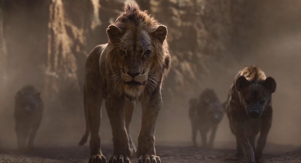 Dans un premier temps nous allons parler de l’animation et de l’esthétique du film. De ce côté là, les équipes de chez Disney ont fait un travail plus que remarquable. Que ce soit les animaux ou la savane, le tout est superbement restitué. Le mélange prises de vues réelles/images de synthèse se confond à merveille et les animaux semblent plus vrais que nature et le côté image de synthèse qui faisait peur à certains passera probablement plus au second plan (j’en reparlerais un peu plus loin). Petit changement par rapport à l’animé de 1994, le film est plus sombre, bien plus sombre. Evidemment certaines scènes ne portent pas à la rigolade, mais j’ai trouvé que l’esthétique générale du film était plus sombre et sérieuse que son ancêtre. On pourra aussi s’interroger sur l’esthétique de certains animaux, mais dans le contexte film « réaliste » ils collent aux animaux qu’ils représentent.