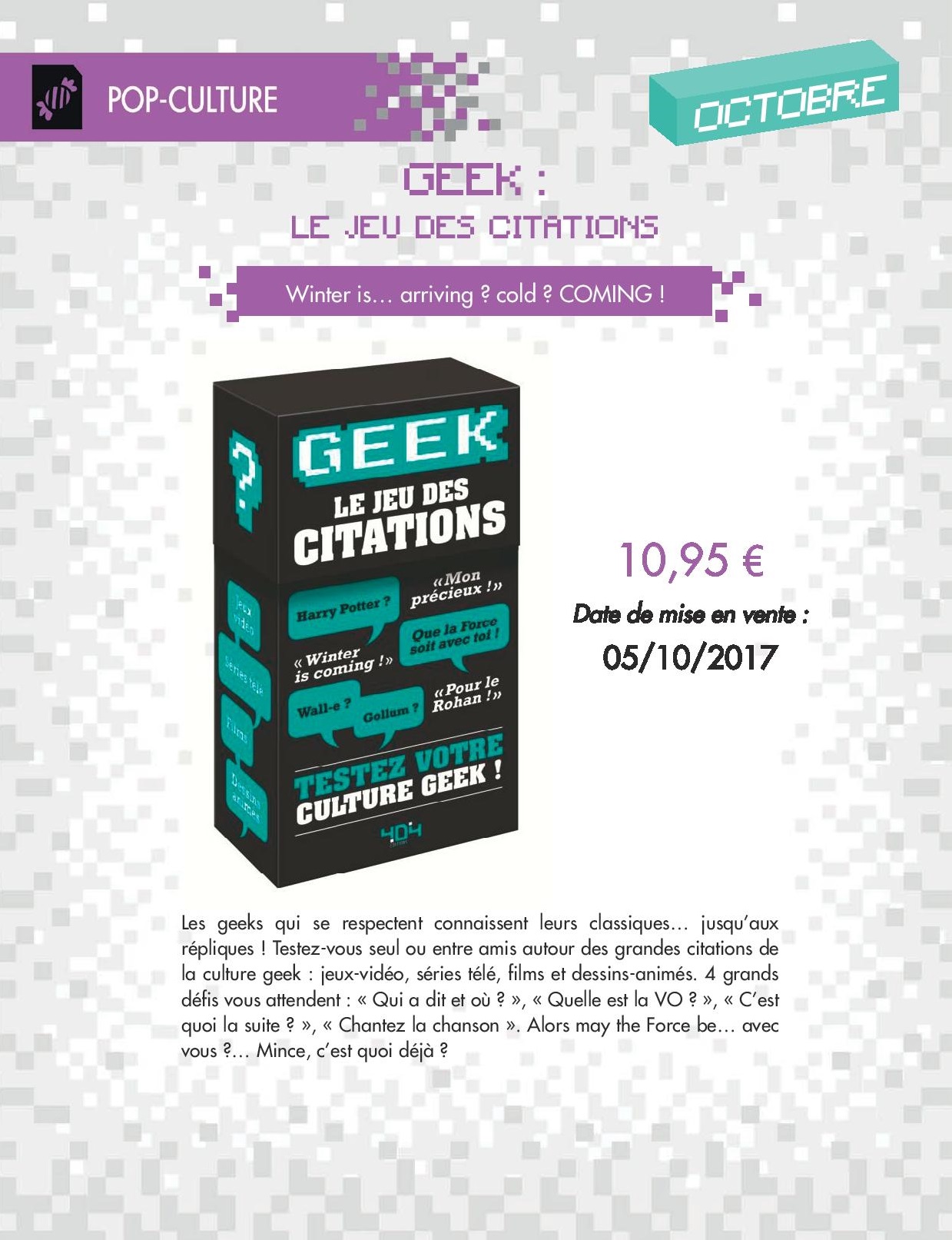 Avis aux amateurs des produits dérivés de la culture geek, 404 Editions, maison entièrement dédiée à la culture geek, vous proposes divers ouvrages et autres articles en lien avec l’univers geek. Il vous est possible de retrouver des ouvrages des licences de jeu vidéo comme World of Warcraft, Overwatch ou encore Horizon Zero Dawn…