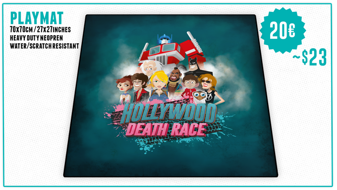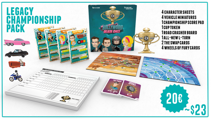 Ce jeu de course illustré par Franck Barré et Antonio Vizcaino se joue de 2 à 6 joueurs et chaque joueur aura à charge deux véhicules qu’il faudra mener sur la ligne d’arrivée en premier! A vous de choisir vos coureurs tout droit inspirés des films et séries que l’on connaît tous. Chaque personnage possède des caractéristiques différentes qui lui sont propre. Votre choix sera donc crucial! Il vous faudra ensuite tenter de traverser les différents plateaux à travers toutes les embûches qui seront mises en travers de votre passage, chacun de ces plateaux disposants de leur propres règles. Pour cela vos personnages disposent de deux SFX qui vous donneront des bonus comme des missiles ou encore un bouclier à utiliser contre vos adversaires ou pour vous sortir d’un mauvais coup.