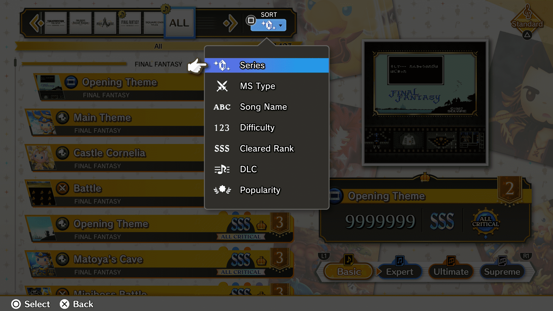 Le jeu de base comprend les titres populaires de plus de 40 jeux différents, avec les dernières musiques de FINAL FANTASY à FINAL FANTASY XV dans la série principale, ainsi que des titres de remakes, spin-offs et différents CD de bandes originales.