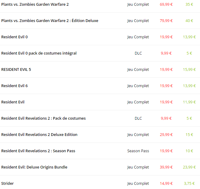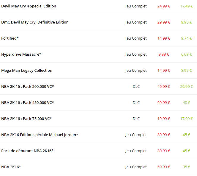 | Nom du Jeu | Type | Réduction |