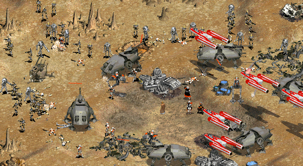 Pour les jeux de Stratégie Star Wars, il y en a deux qui ont marqué durablement nos âmes de joueur ; le premier c’est Star Wars Galactic Battleground. Pour celui-ci, imaginez la fusion entre Age of Empire II et l’univers Star Wars, et vous aurez droit de contrôler plusieurs factions comme l’Alliance Rebelle, l’Empire Galactique, les Wookies, les Naboo, les Gungans, ou bien la Confédération du Commerce. Si vous possédez son extension vous pourrez rajoutez les armées de la République et celle des Séparatistes.