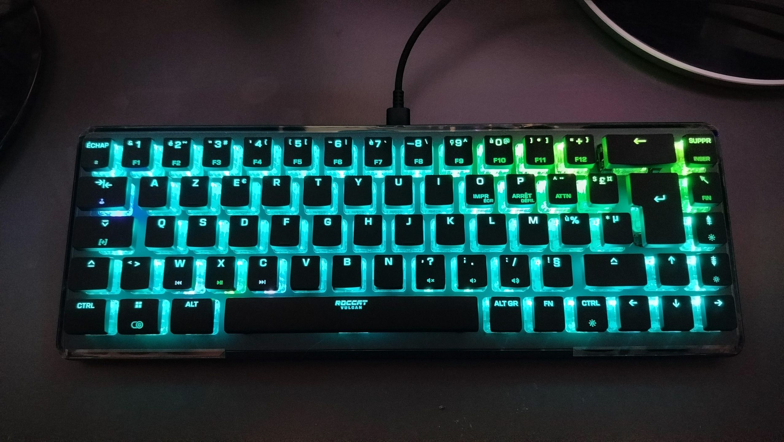Comme vous pouvez le voir, c’est un clavier compact, c’est à dire qu’une partie de celui-ci a été retirée afin de gagner de la place. Par rapport à un clavier standard où toutes les touches sont présentes, ici la rangée de touche de fonction (F1 à F12) disparait pour être groupée à la rangée de chiffres et ces fonctions seront accessibles via la touche fonction rajoutée à proximité de la barre d’espace. Le pavé numérique disparait lui aussi afin de gagner en largeur de clavier, mais contrairement aux claviers 60% qui eux font aussi disparaitre les touches fléchées et les boutons présents dans la grappe des boutons insérer/supprimer, sur la configuration à 65% ces derniers sont tout de même présent.
