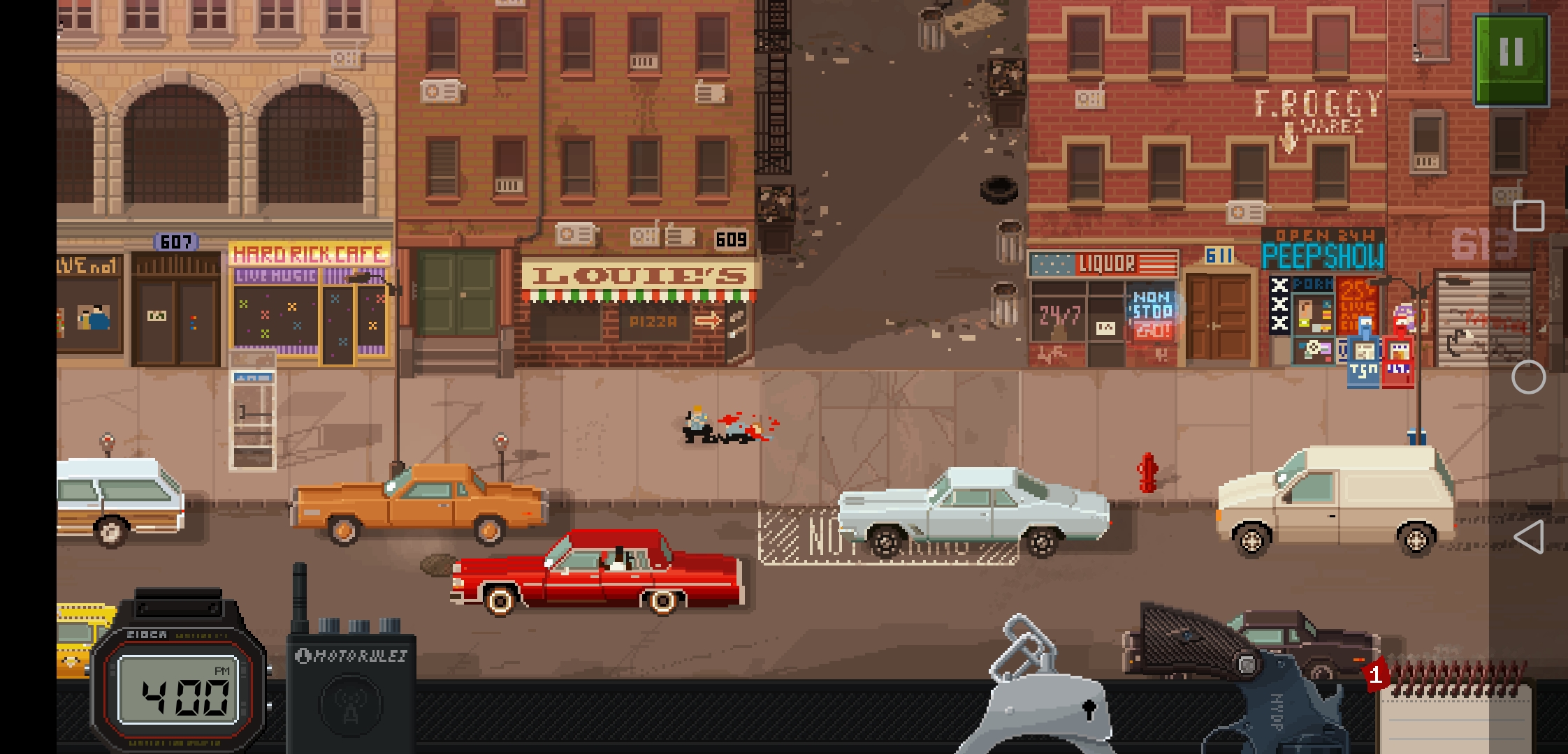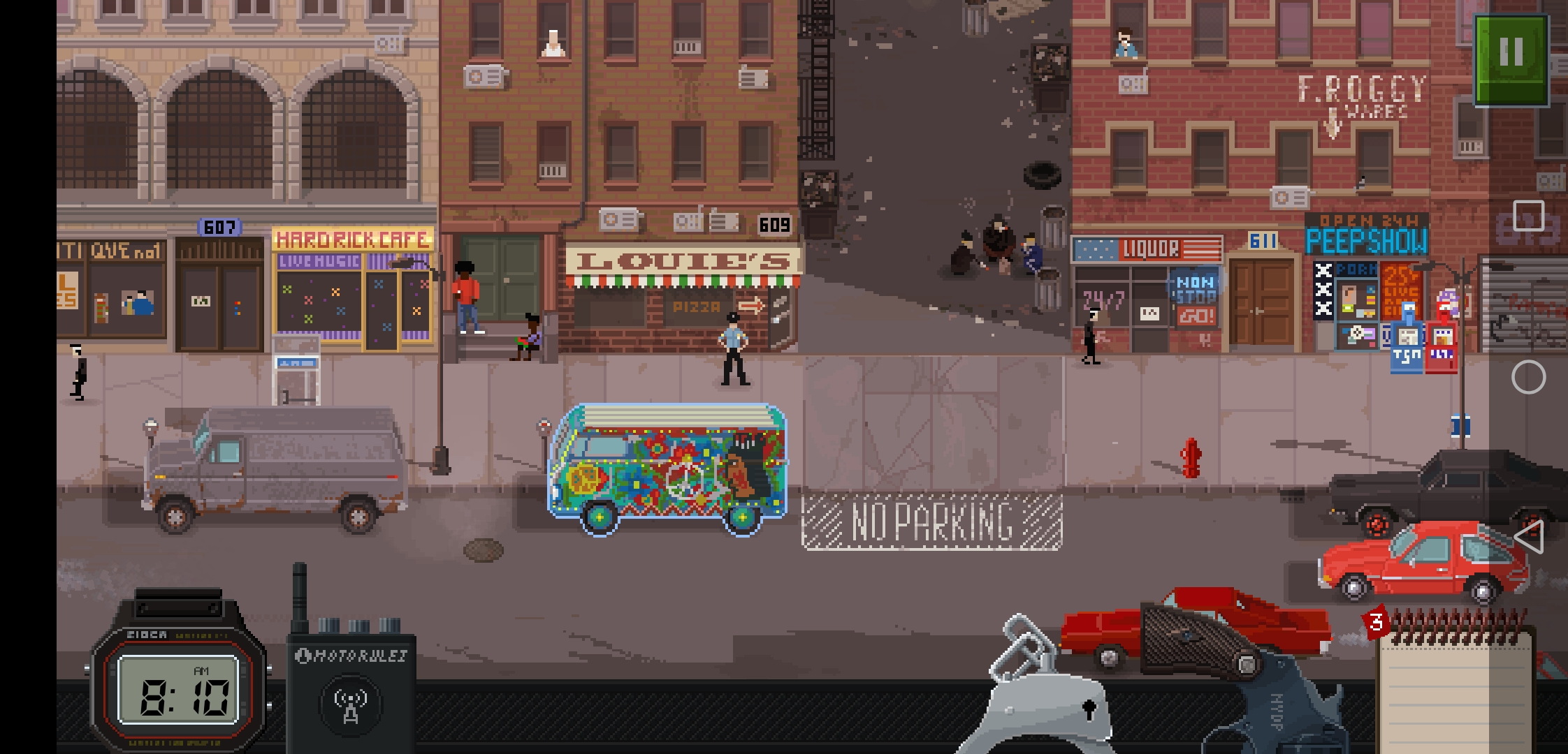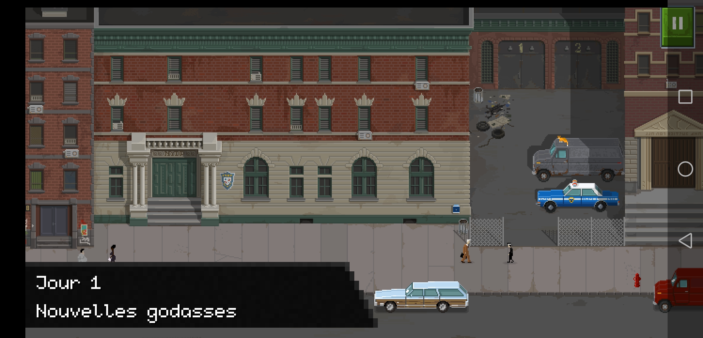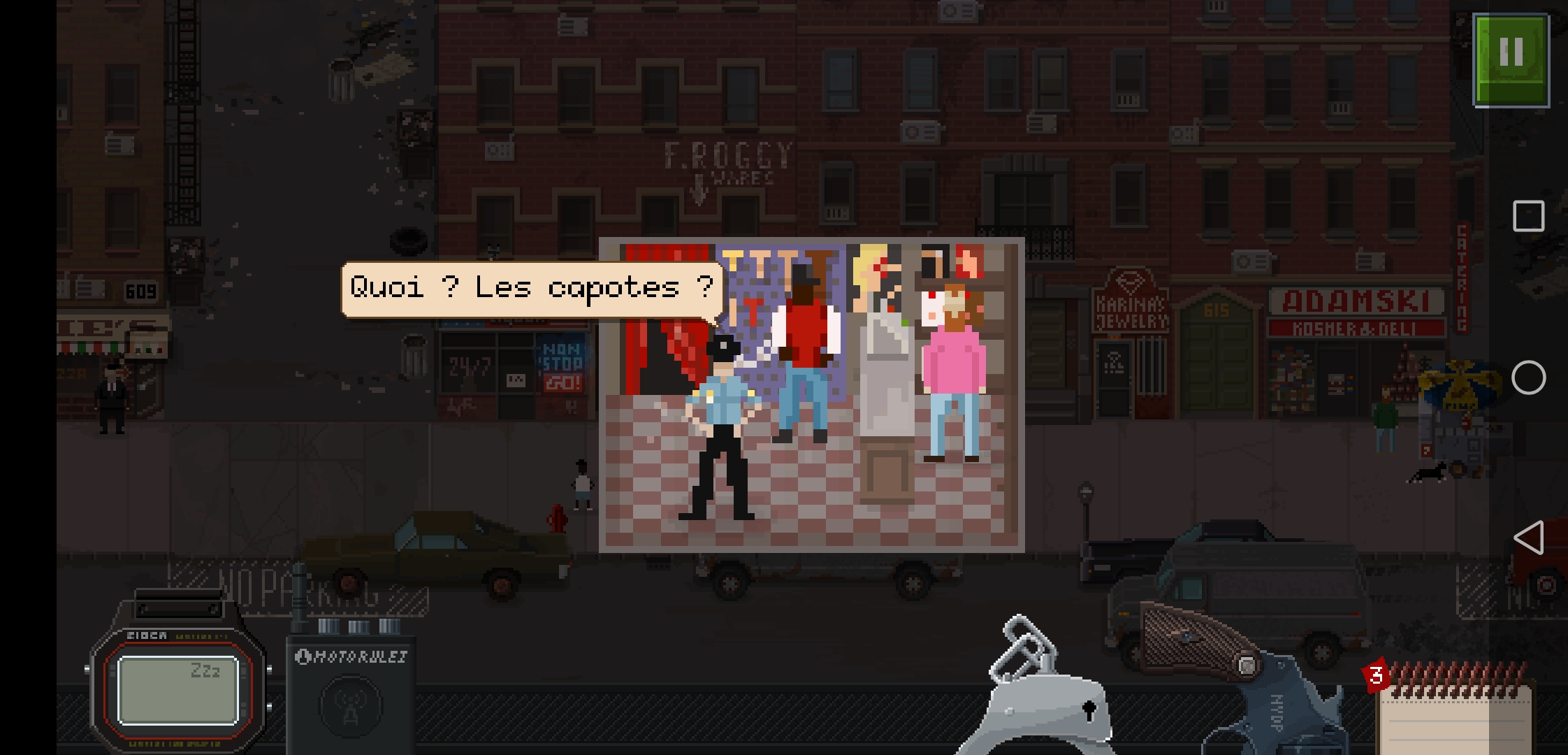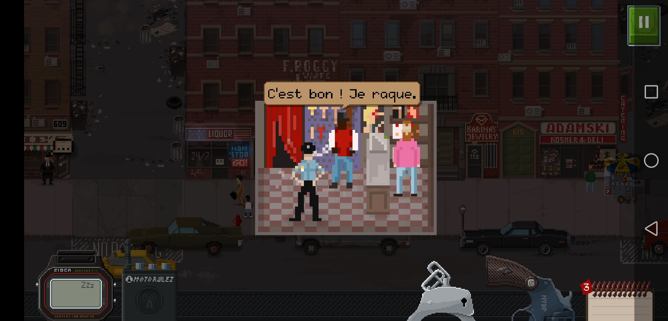 On va tout de suite commencer sur un point assez privilégié par beaucoup de gens: les graphismes. Si vous n’aimez pas les jeux tout en pixels, c’est n’est pas la peine d’aller plus loin dans la lecture de ce test puisque le jeu est tout en pixels. C’est un choix voulu par l’éditeur et concepteur du jeu. En effet Pixel Crow qui, pour le coup porte bien son nom, souhaitait imprégner son jeu de l’atmosphère des séries et films policiers des années 80. Le jeu est relativement beau et mine de rien on n’imagine pas que des graphismes en pixels puissent être aussi fins. Vous retrouvez un Brooklyn des années 80 très vivant. Vous êtes un détective accusé à tort de meurtre et êtes rétrogradé en « simple trouffion » dans la rue où vos missions seront de coller des prunes et surveiller une rue pendant toute la journée.