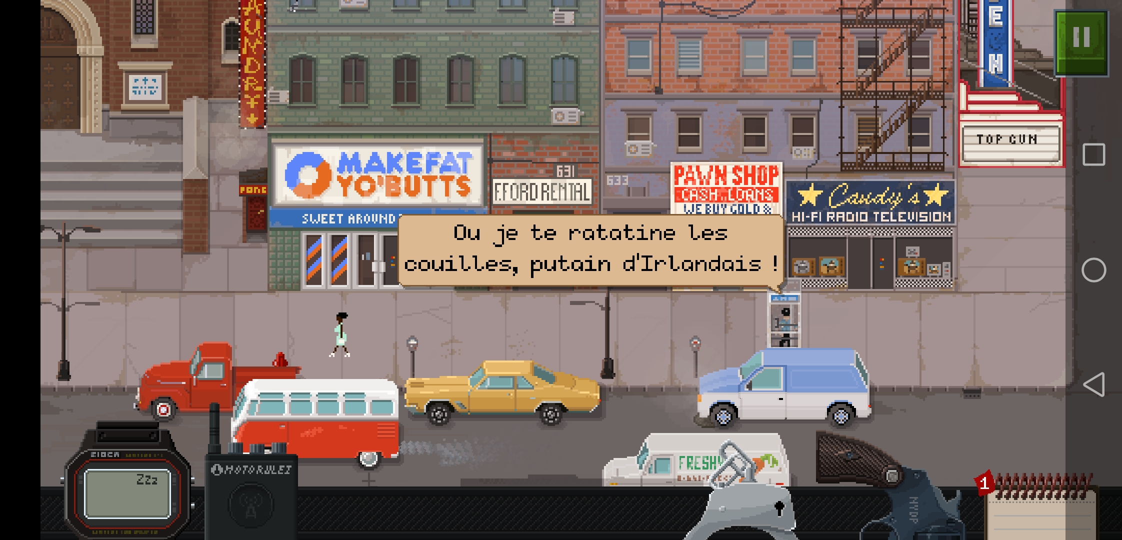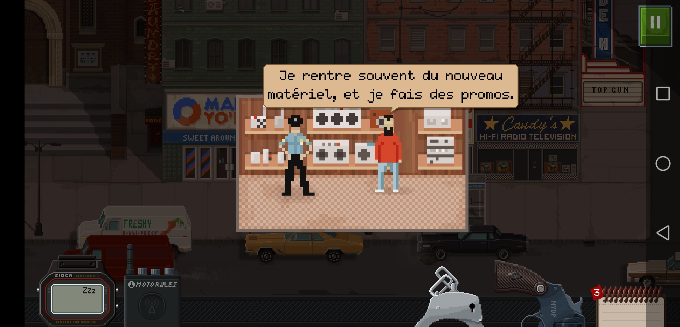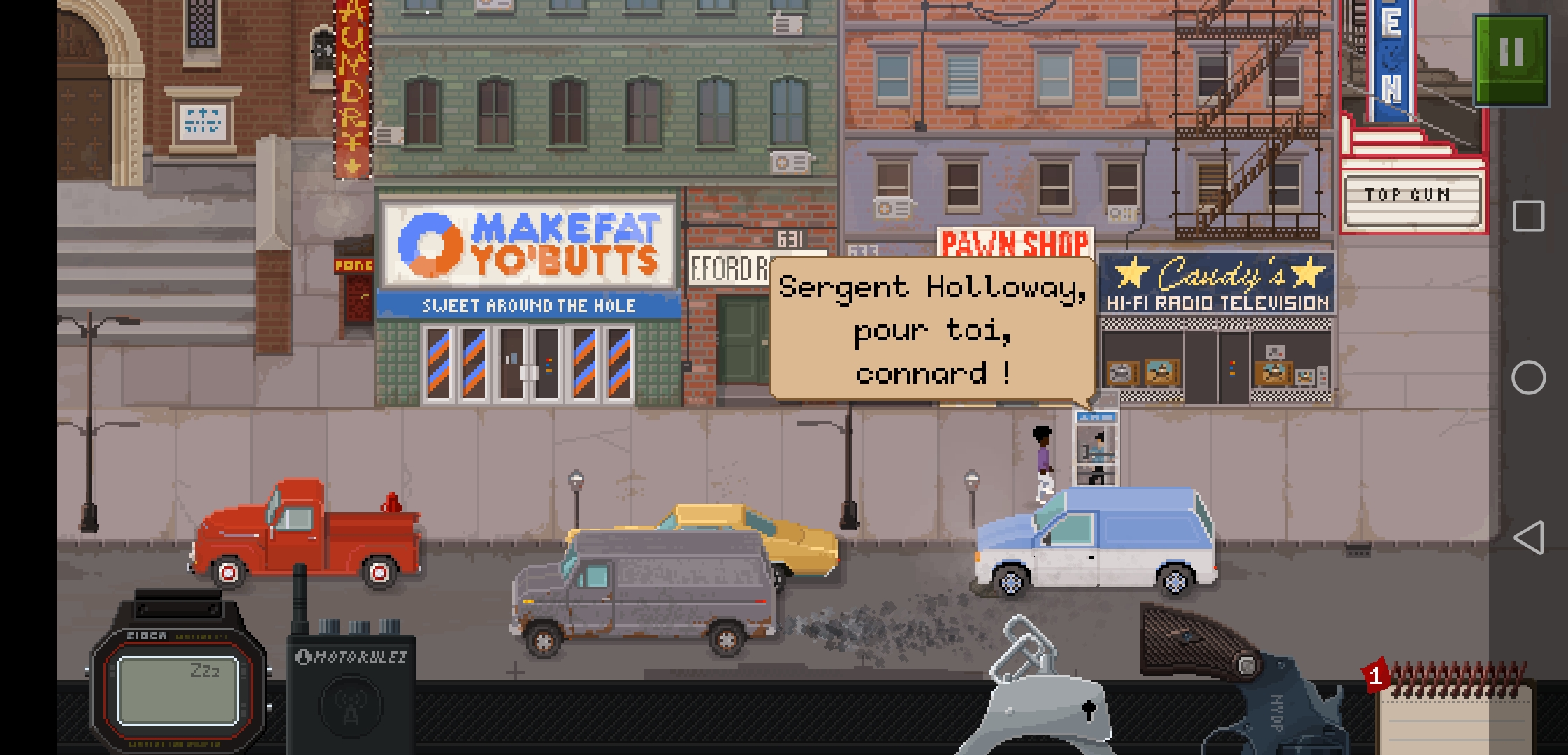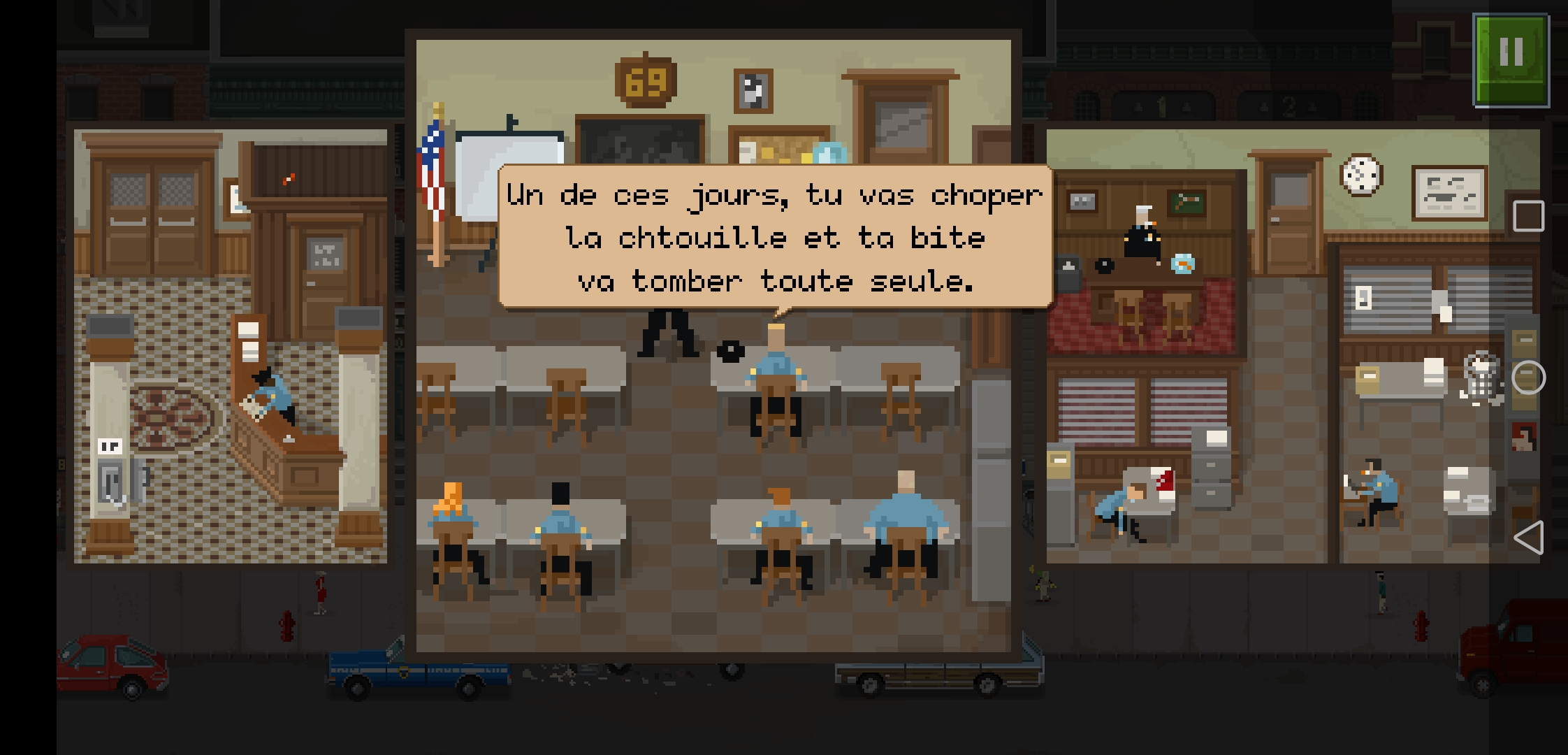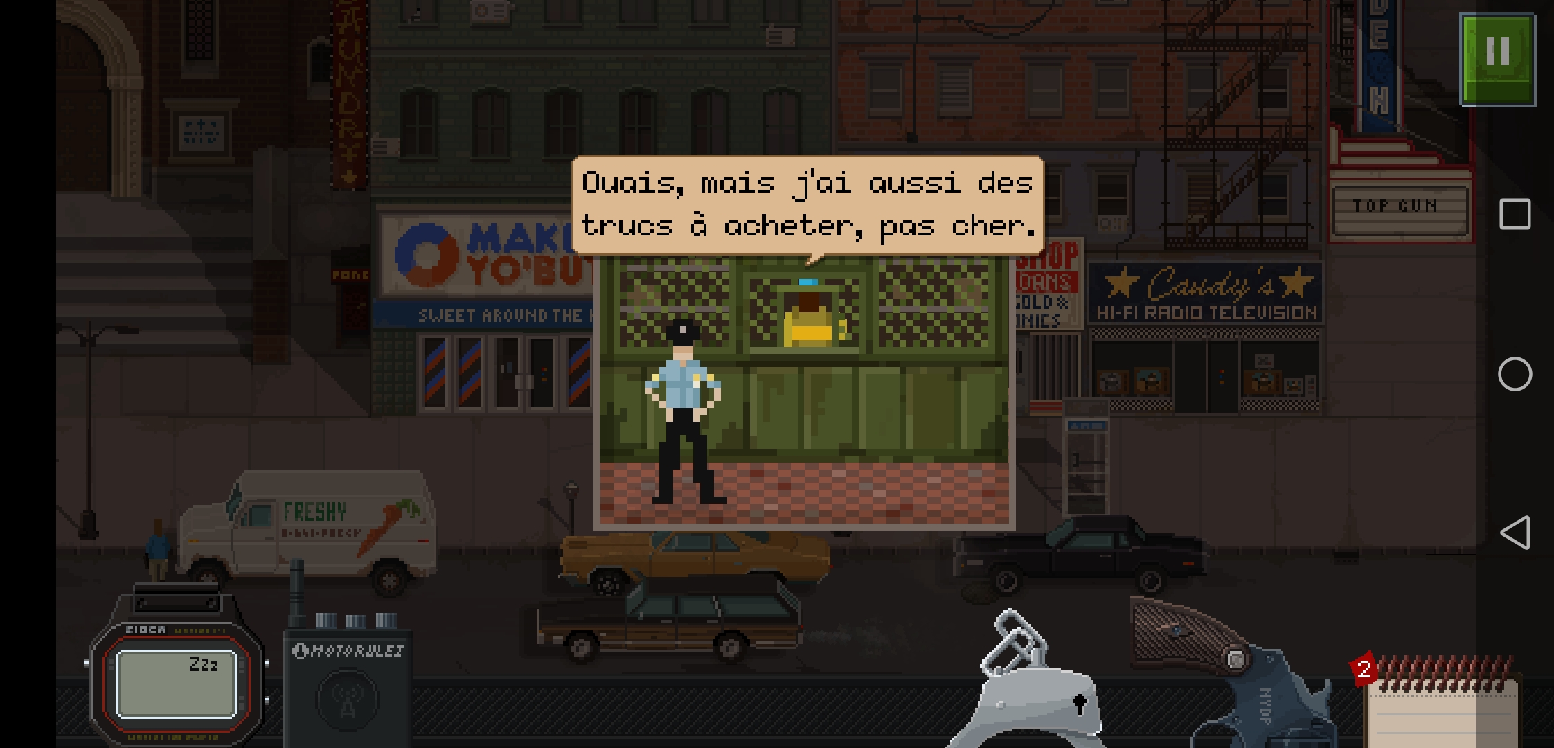 Au final que dire de ce petit jeu? Le côté rétro/années 80 fonctionne à merveille, l’univers est assez vivant et on s’amuse à arpenter la rue de long en large pour voir ce qu’il s’y passe et pour y coller aussi quelques prunes pour voir ce que ça va donner comme réactions. Le petit bémol c’est que par moments il y a quelques latences dans le jeu, pendant lesquelles il n’y à rien à faire d’autre que d’attendre. Si vous êtes fans de jeux sur mobiles et que vous voulez un petit jeu qui vous prendra peu de temps dans les transports par exemple, Beat Cop est fait pour vous. C’est un petit jeu sans prétention et vous pourrez vous essayer au début du jeu, si ce dernier vous plaisait, sachez qu’il ne vous demandera que 4.99€ pour débloquer le jeu en totalité.