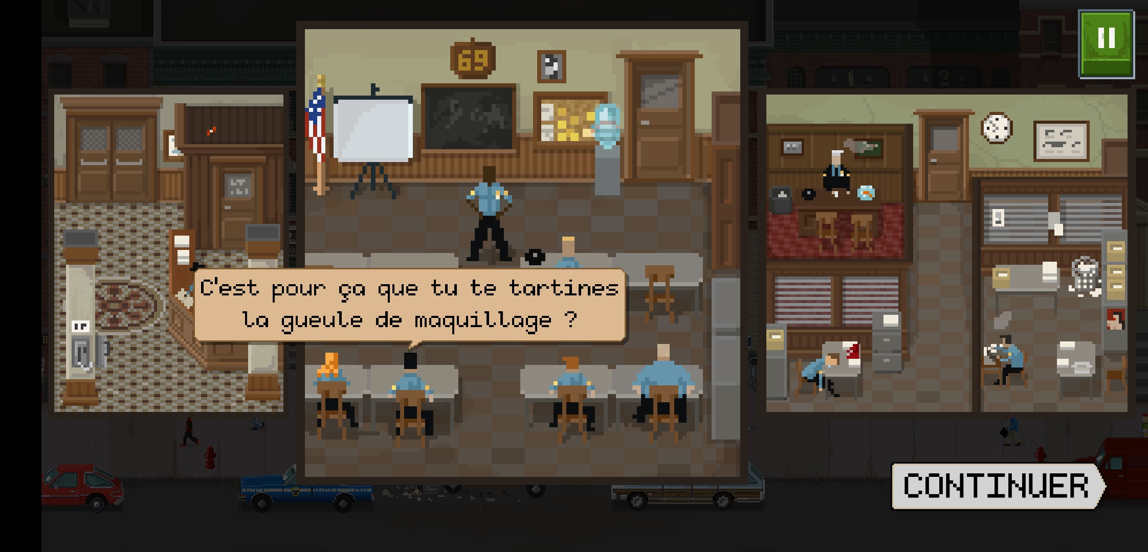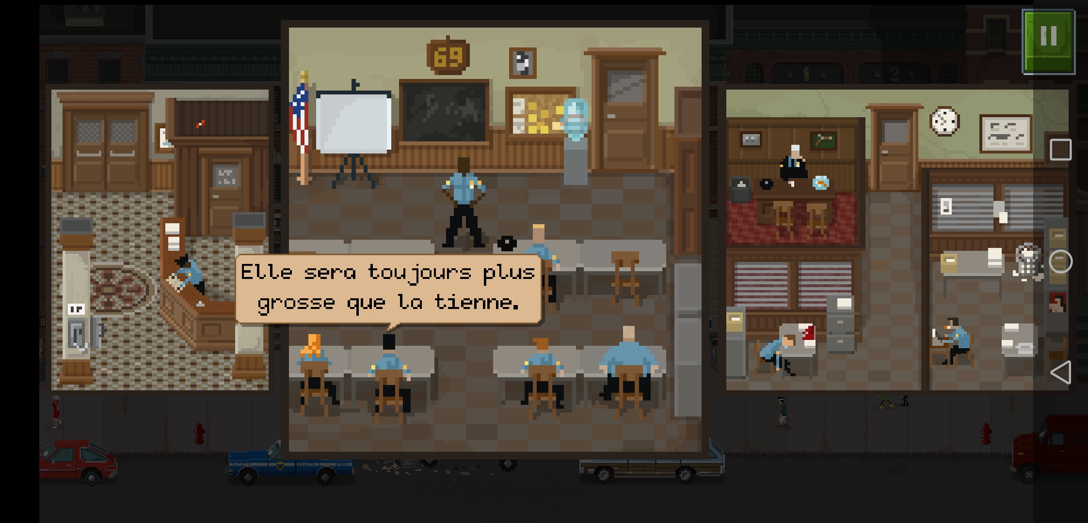 Le gros point fort du jeu est, pour moi, sans conteste, sa traduction française intégrale. Alors par contre ne vous attendez pas à des expressions châtiées, le langage exprimé dans Beat Cop est relativement … Fleuri ! Et c’est ce qui lui donne son identité propre, on a plaisir à chercher les dialogues avec les autres personnages. C’est à travers ce langage que l’humour du jeu est formulé. On sourit souvent devant les expressions et interactions faites entres les personnages et dès le briefing du matin vous pourrez commencer votre tranche de rire. Entre le fou de sexe, l’addict à la bouffe ou la seule nana du groupe, les vannes et les pics fusent dans tous les sens.