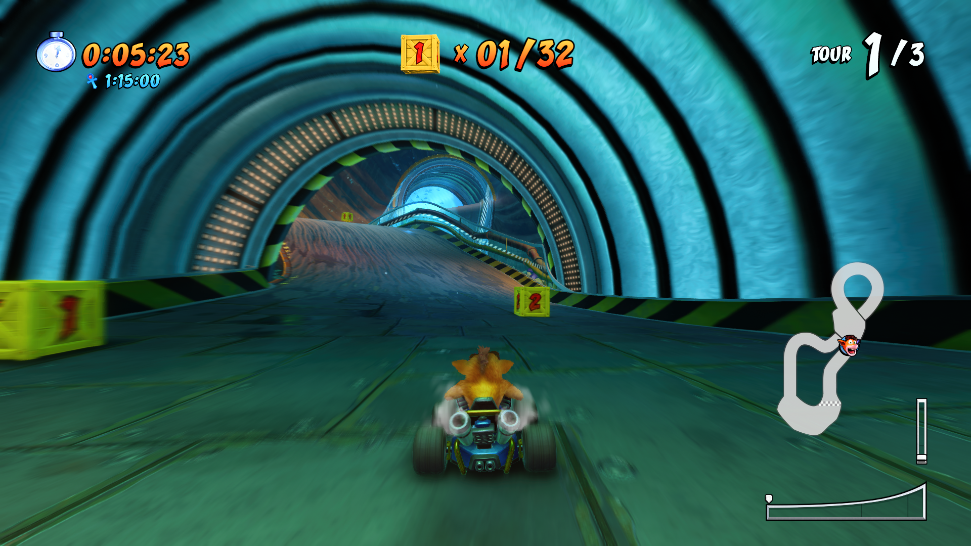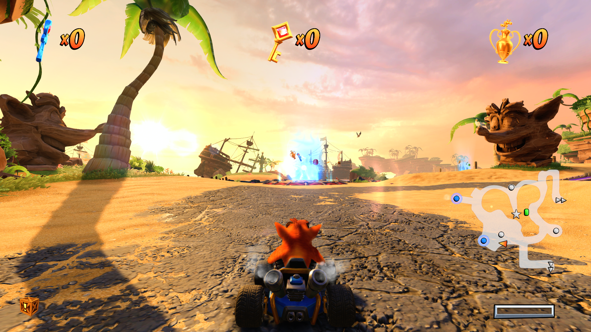 Commençons par le mode aventure. Celui-ci vous mettra dans la peau d’un des coureurs de la terre qui devront arriver à récupérer des coupes disséminées dans plusieurs courses afin de battre Nitro Oxyde qui compte bien faire de notre chère planète un parking géant s’il arrivait à nous vaincre. Pour ce faire, vous devrez arpenter les 4 principales zones de la campagne d’aventure et y récupérer les 4 coupes avant de battre le boss de chaque zone. Comptez environ une petite dizaine d’heures pour terminer le mode aventure en le complétant en ligne droite. Bien entendu comme tout Crash qui se respecte, gagner ces coupes ne vous permettra pas d’atteindre le 100%, une fois chaque course terminée, il vous sera possible de les rejouer avec deux modes différents: