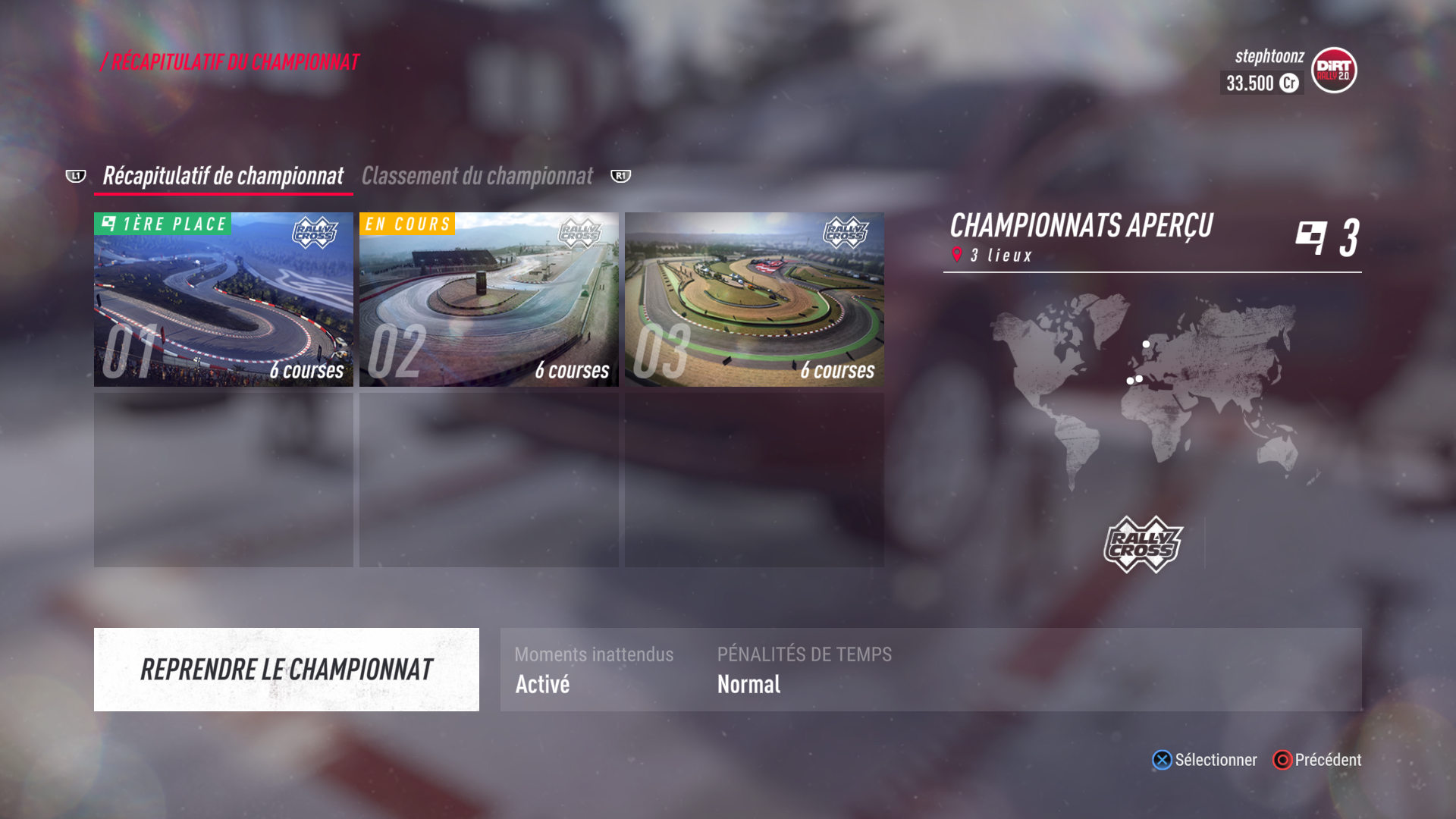 Le mode Carrière Rallycross lui vous mettra en face de 3 parties, scindées, elles, en 6 courses. Ce mode vous fera concourir sur des circuits fermées, durant lesquels vous devrez vous qualifier tour à tour pour accéder à la demi finale, puis à la finale. Dans ce mode là vous aurez vos adversaires présents physiquement sur la piste et parfois il vous faudra faire grincer un peu la tôle afin de vous frayer un chemin vers la victoire. Comme pour la Carrière Rally, les dégâts et réparations que vous subirez seront à faire entre chaque manche de qualification.