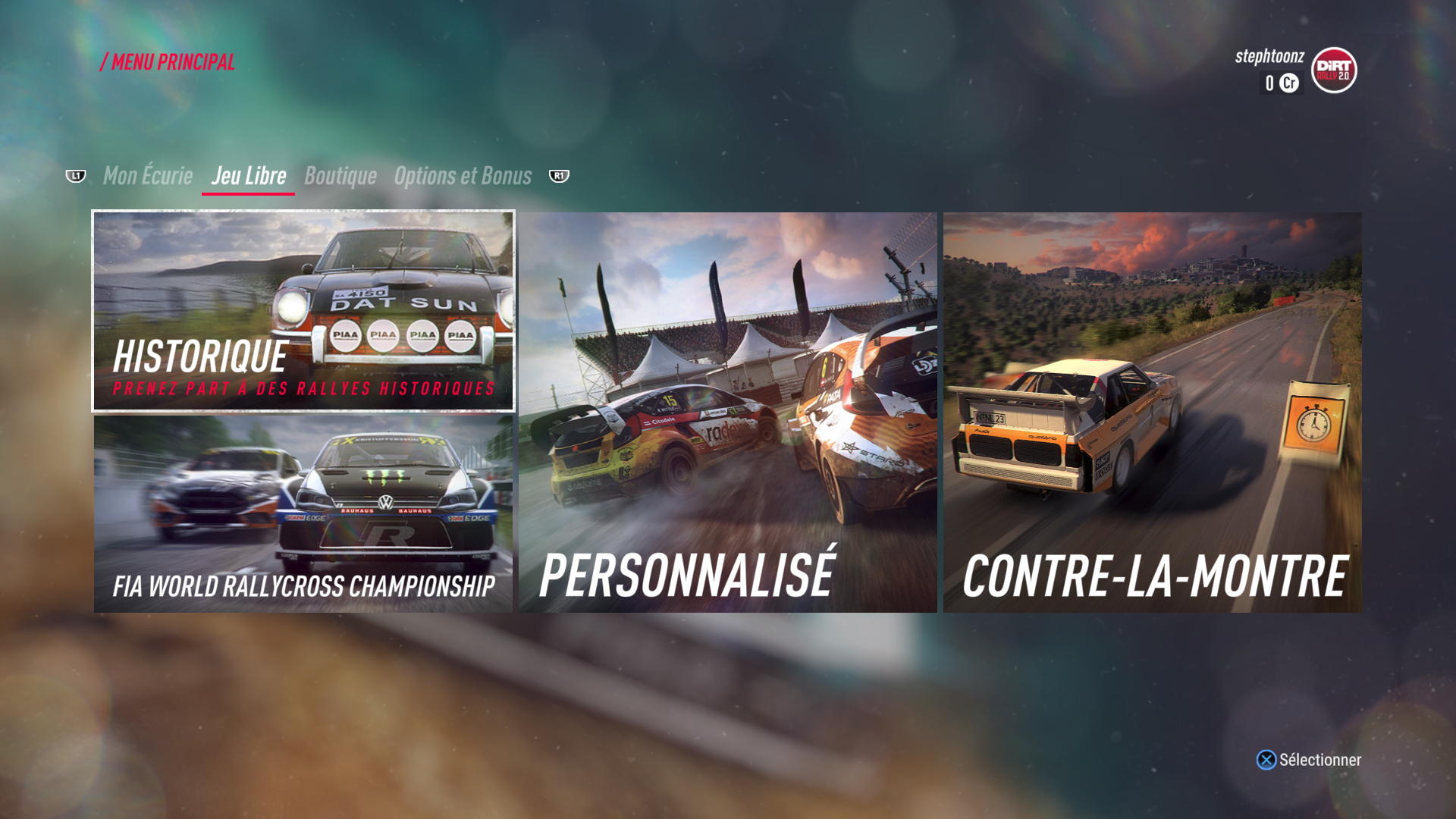 Ensuite nous arrivons sur le menu de base d’où vous pourrez lancer toutes les activités. La première chose qui surprend, c’est qu’il n’y a pas de campagne à proprement parler, c’est la catégorie épreuves qui fera office de mode « histoire ». Bien entendu dans un tel jeu pas d’histoire à suivre, mais des épreuves à remporter afin de vous hisser en haut du classement. Outre des épreuves dites historiques qui vous permettront de revivre des moments mythiques des courses de rally, vous retrouverez les bien connus modes personnalisé et contre la montre.