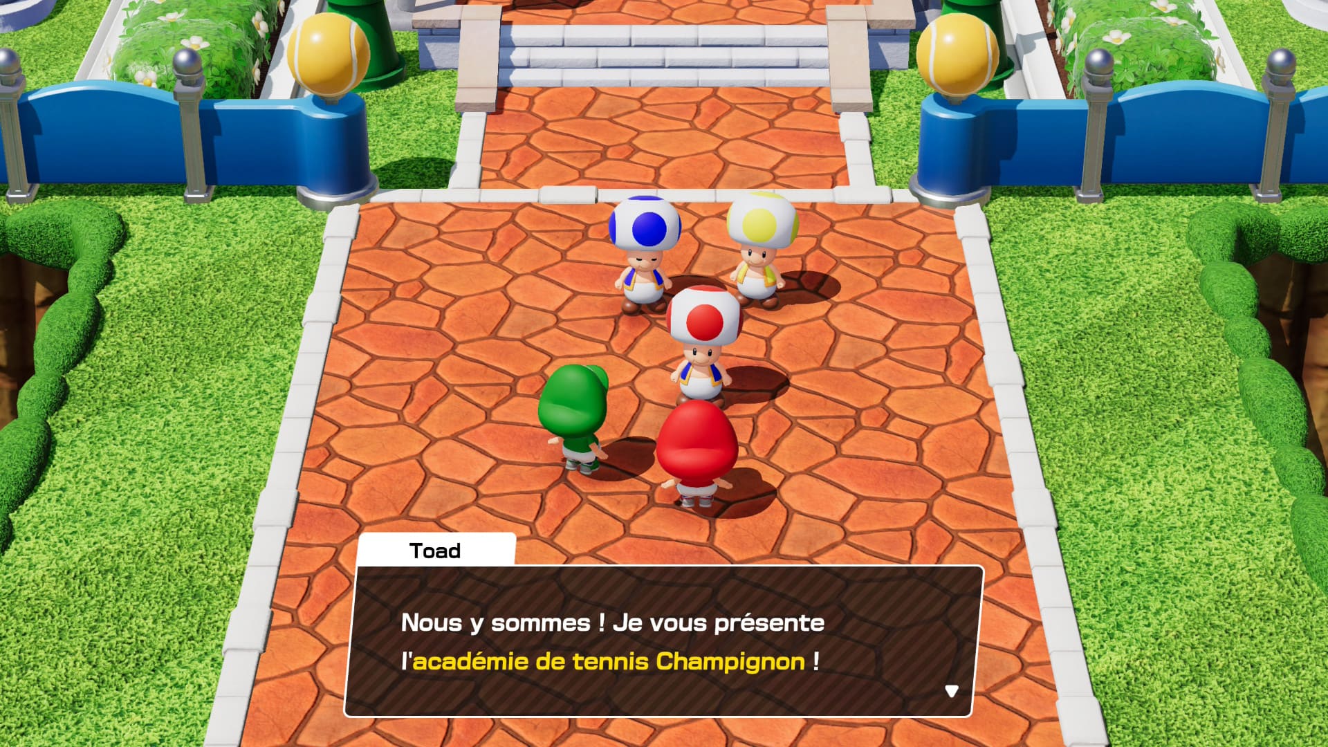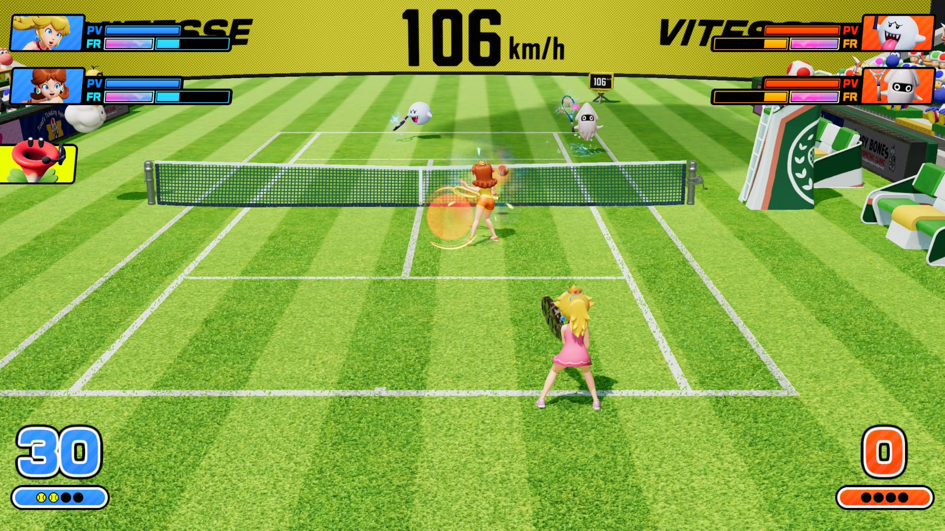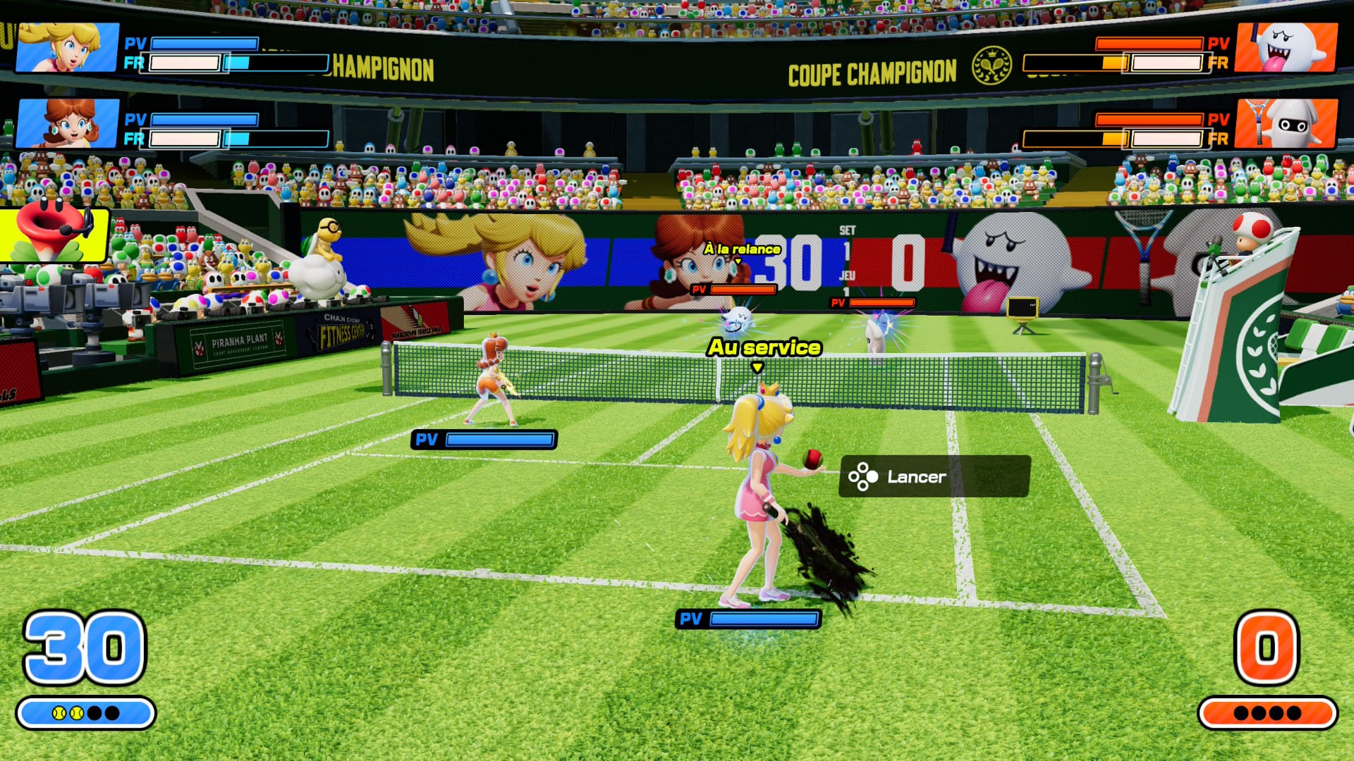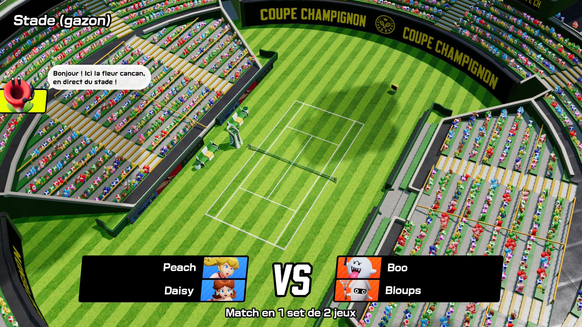 Dès l’écran de lancement, Mario Tennis Fever impose une identité visuelle immédiatement reconnaissable. Les terrains sont inspirés du Royaume Champignon et chacun est richement décoré avec des éléments interactifs et colorés. Les personnages emblématiques de Mario – de Luigi à Bowser en passant par Yoshi et Peach – sont animés avec soin, et chaque coup, smash ou effet spécial bénéficie d’animations spectaculaires qui donnent un vrai dynamisme aux matchs.