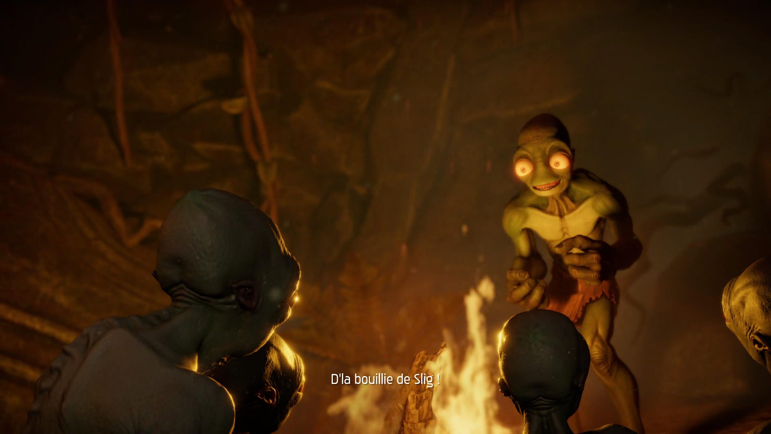 Un peu compliqué de situer l’histoire de cet épisode Soulstorm. Ce n’est pas un remake du 2, mais il vient à la suite du premier. Selon les déclarations des développeurs, ce serait plutôt une réécriture du 2, comme ils auraient voulu le faire à l’époque sans en avoir les moyens techniques et financiers. On retrouve donc Abe et ses amis qui viennent de s’échapper de l’usine et fêtent leur nouvelle liberté au fond d’une grotte avec de bonnes Bières. Bien sûr, la tranquillité ne dure jamais quand on est un fugitif et l’aventure va donc rappeler Abe à son bon souvenir.