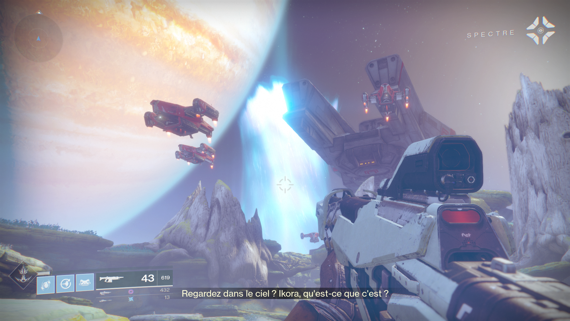 Rapidement votre Spectre vous propose d’aller voir le fragment du Voyageur écrasé non loin et ce dernier vous permet de retrouver la lumière, soit votre pouvoir de classe mais réduit au plus bas niveau (pratique hein ?) Cela ne concerne que moi mais Bungie aurait dû pousser cette phase sans pouvoir plus loin pour permettre une meilleure immersion dans ce monde où le dernier rempart de l’humanité a été brisé si facilement, et où nous, joueurs, ne sommes plus que de simples soldats, mais j’imagine que dans un souci de plaire au plus de monde possible, cette phase “hardcore” n’aurait pas plu.. soit