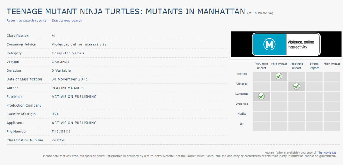 Le système de classification australien et brésilien, avait fait état d’un jeu Tortues Ninja, en préparation par PlatinumGames.
