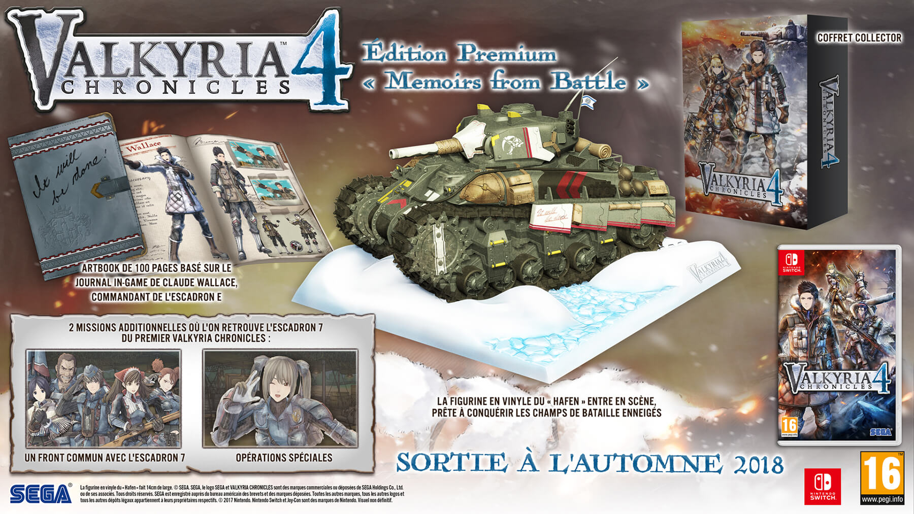 Rejoignez la lutte pour l’Empire avec l’édition collector « Memoirs from Battle » de Valkyria Chronicles 4, et plongez dans deux nouvelles aventures avec vos personnages préférés de l’escadron 7 de la version originale de Valkyria Chronicles. Cette édition spéciale (prévue à 99,99 $ et qui devrais logiquement vous couter autant en Euros) est dotée d’un livre d’art exclusif sur le thème du journal de voyage de Claude et d’une réplique de son puissant char, le Hafen. Armez-vous pour la bataille en précommandant l’édition premium « Memoirs from Battle » aujourd’hui sur le site officiel !
