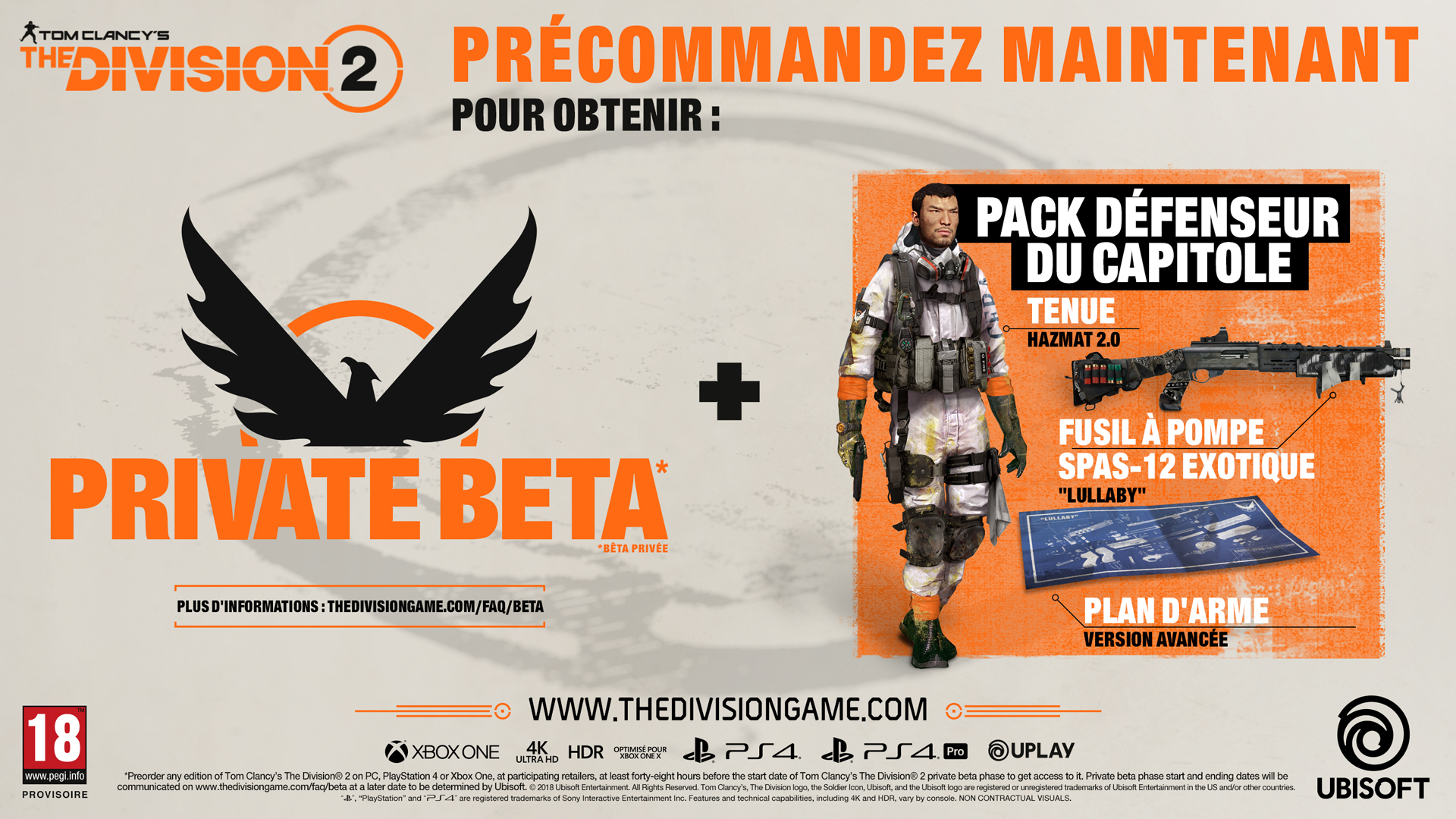 Revenons au sujet principal, pour ceux qui précommanderont le jeu, sachez pour commencer qu’elle vous donnera accès à la bêta privé, mais également au pack Défenseur du Capitole incluant 2 objets in-game : « Lullaby », un fusil exotique SPAS-12, et la tenue Hazmat 2.0.