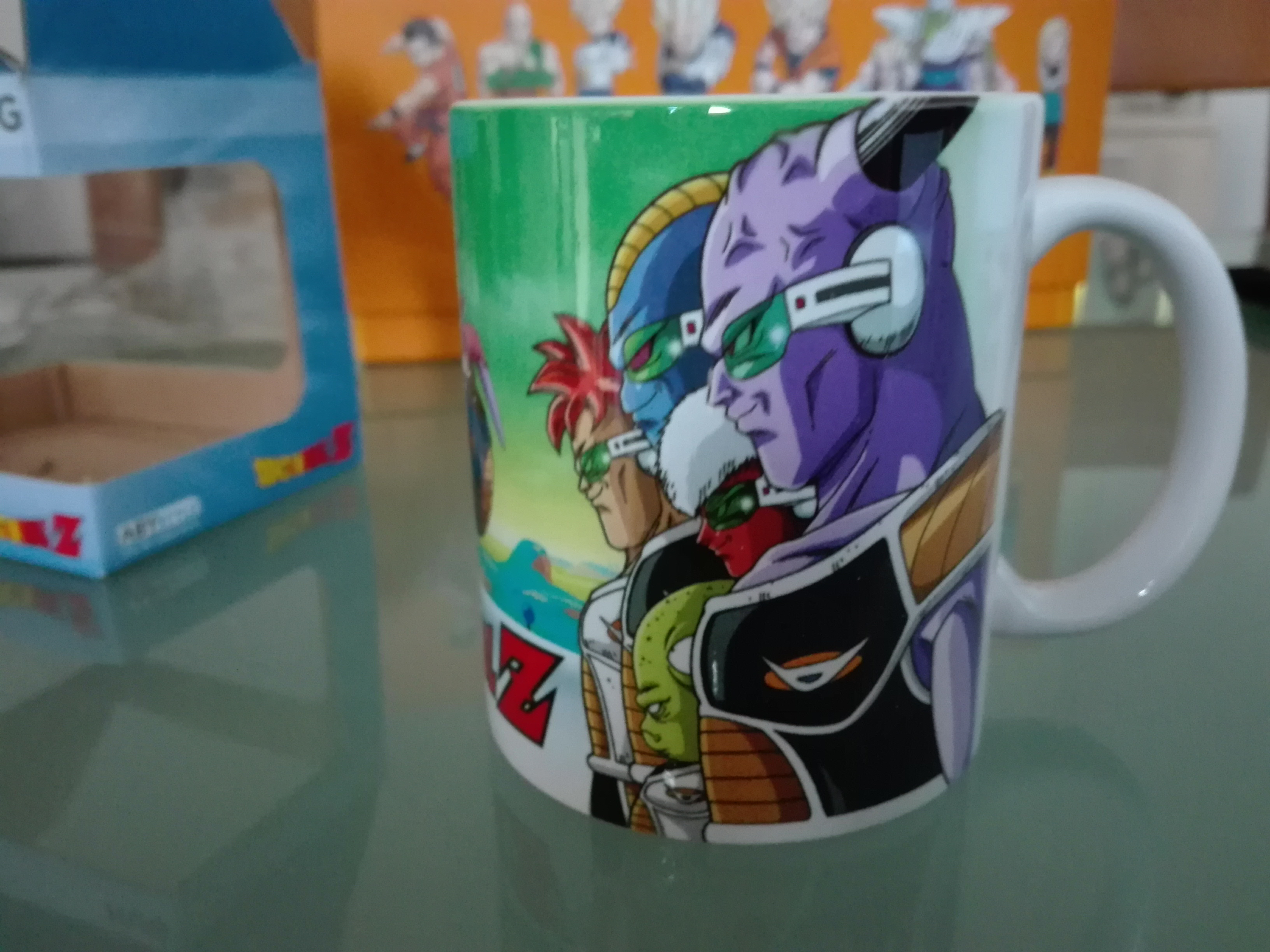 Prenant notre courage à deux mains, nous ouvrons donc le carton afin de relâcher toute la puissance contenue à l’intérieur, et nous tombons directement sur un mug. Celui-ci représente une sorte de diorama d’une des premières batailles les plus importantes du manga: d’un côté notre team de héros se dressera contre la team du commando Ginyu, chacun ayant l’objectif soit d’abattre, soit de défendre le maléfique Frieza au centre de ces deux teams.