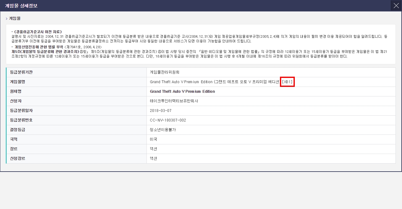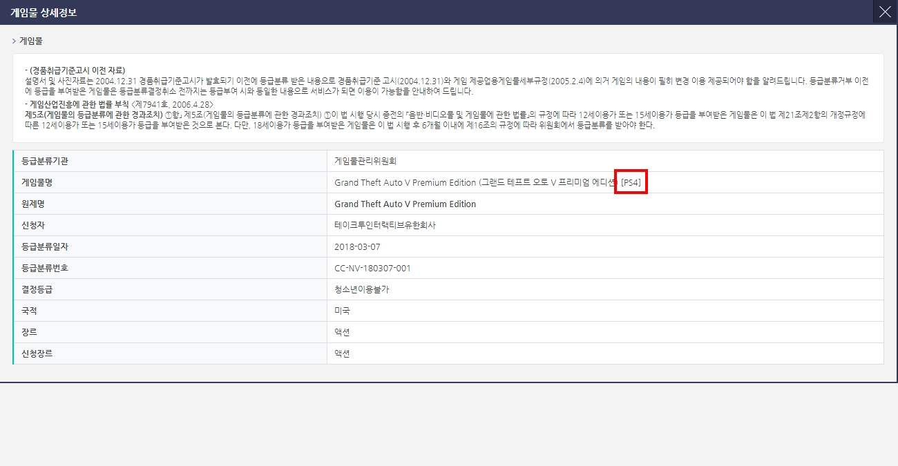 Bref, revenons à nos moutons : Grand Theft Auto V Premium Edition est enregistré sur Xbox One et sur PlayStation 4, et c’est Interactive Co., Ltd. qui a fait la demande de classification du jeu. Si on demande à Google Traduction de traduire une à une chaque case du tableau (car non, chez Spirit nous ne sommes paaaaaaas bilingue français/corééen) on apprends aussi que le jeu a pour nationalité les Etats-Unis et qu’il est du genre action. On peut donc peut-être penser que Rockstar Games souhaite faire une version « premium » du jeu…