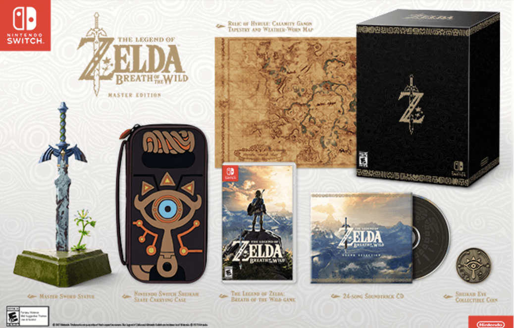 Si l’édition collector européenne, exclusive à la Switch, comprendra le jeu, une reproduction miniature de Sword Master et la bande originale du jeu, le collector américain contient, en plus de tout cela, une pochette de rangement pour la Switch, une carte du jeu et une pièce Sheikah Eye.