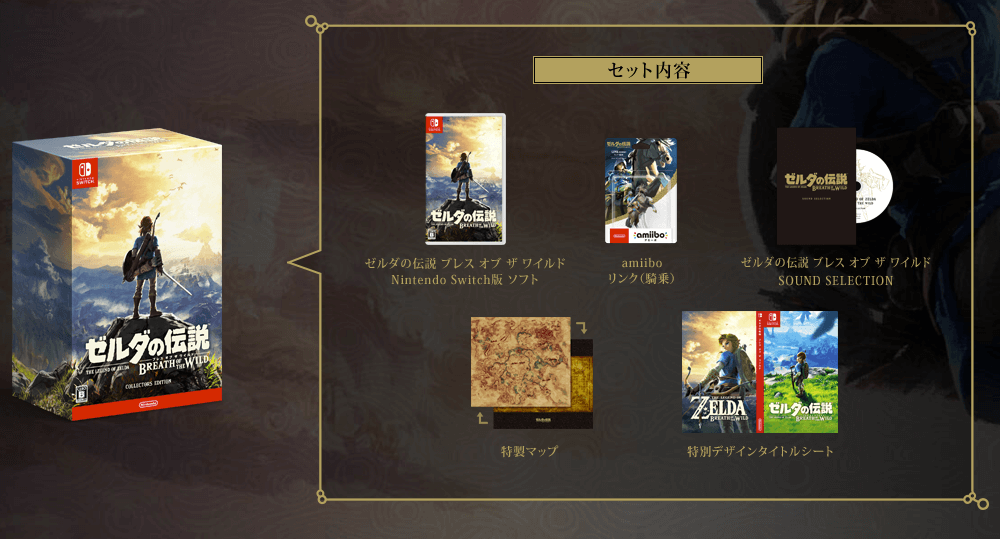 En ce qui concerne les éditions collector japonaises, la standard contiendra une copie du jeu, une autre couverture, un amiibo de Link à cheval, un CD comprenant 24 titres du jeu, la carte du jeu alors que l’édition Deluxe ajoutera une statuette de Sword Master et quatre cartes postales.